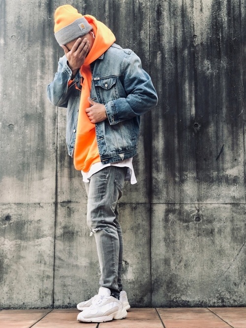 使いまわしの効くグレーパンツは、デニム素材のアイテムも揃っています。オレンジのパーカーとニット帽にもマッチしますし、またストリート感を一気に高めます。足元には大きなシルエットのスニーカーを合わせて、よりストリートコーデっぽく仕上げてみてください。