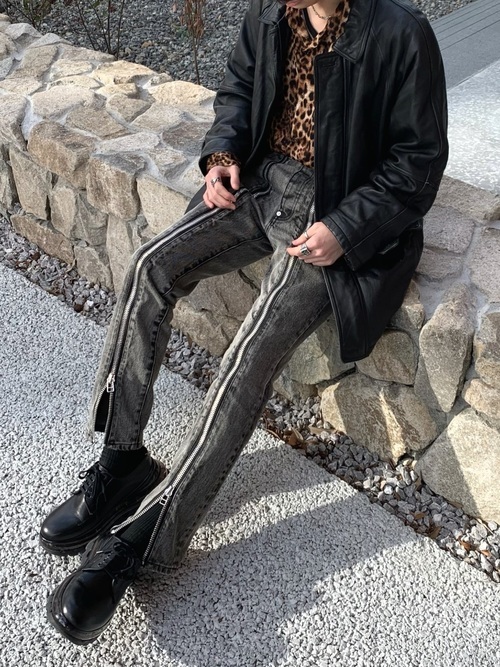 グレーデニムパンツ×ヒョウ柄シャツコーデ