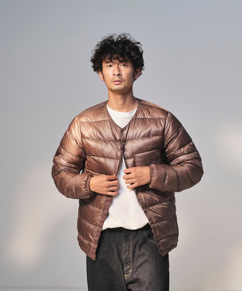 シンプルなカーディガンのようなインナーダウン。袖がデタッチャブル仕様になっており、袖を外すとダウンTEEに早変わり。シーンに合わせて対応可能な2WAYモデルです。表裏生地にはリサイクルナイロン、羽毛にはリサイクルダウンを使用。ダウンをふわりと感じる、薄手で柔らかな着心地。
