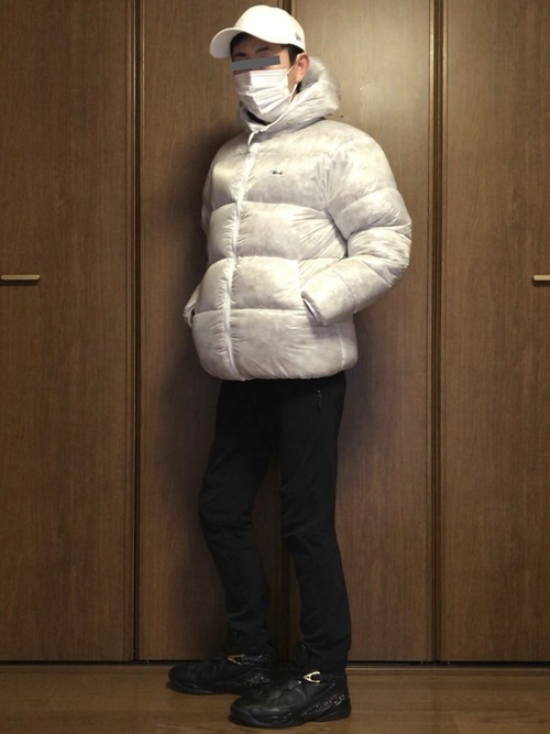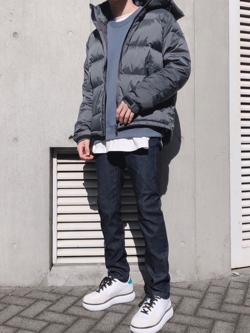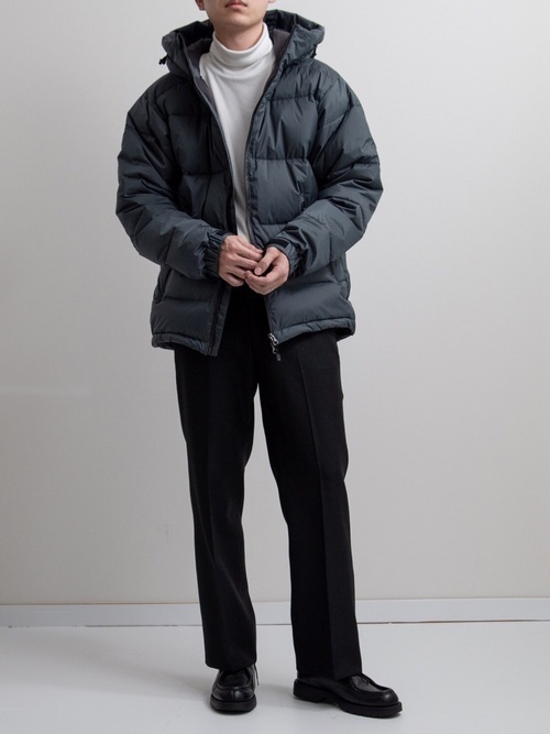 中のダウンが透けて見えるという、珍しいダウンジャケットを使ったコーデ。カラーとしては白×黒のワントーンですが、ダウンが透けて見えると不思議な雰囲気が出ますね。人と同じはつまらないという人におすすめ。