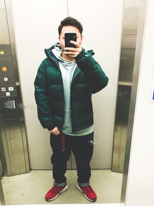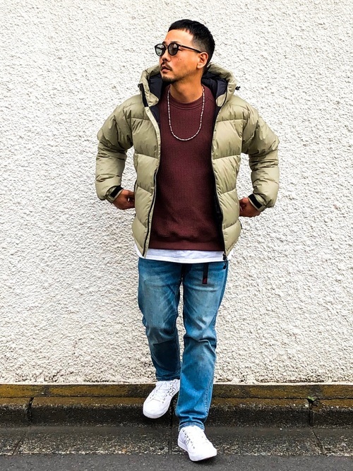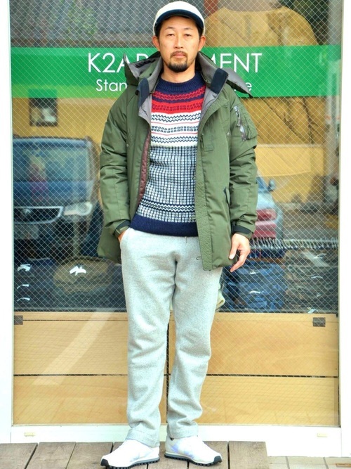 柄ニットにグレーのパンツ、カーキのダウンジャケットというメンズコーデ。リラックス感を感じさせつつ、ダウンジャケットで雰囲気を引き締めています。ラフなパンツにもダウンジャケットは相性がいいですね。