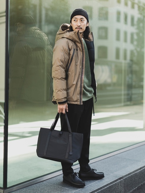 ナンガとアーバンリサーチドアーズのコラボダウンジャケットを使ったメンズコーデ。小物にも気を使い、ストリート感を感じさせるおしゃれな着こなし。ダークトーンのインナーとベージュ系のジャケットで絶妙なカラーマッチです。