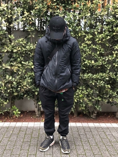 キャップからダウンジャケット、パンツまで、全体を黒でまとめたメンズコーデ。カジュアルながら黒でまとめることでスタイリッシュな印象もプラス。インナーの柄シャツをちらっと見せているのがポイントです。
