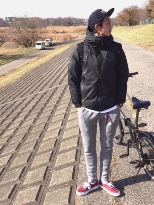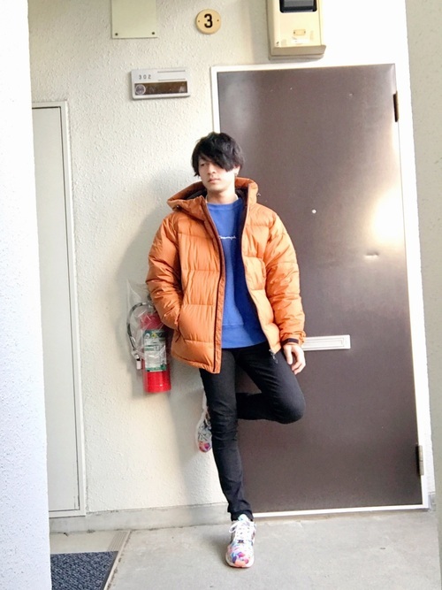 青いスウェットとオレンジのダウンジャケットで目にも楽しいカラフルなメンズコーデです。シューズもカラフルなスニーカーで、遊び心が満載の着こなし。見ているだけでも気分が明るくなるコーディネートですね。