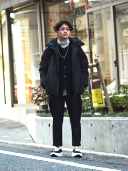 カーディガンにダウンジャケット、スラックスというメンズコーデ。大きめのダウンジャケットで上半身にボリューム感を持たせ、下半身はテーパードシルエットのパンツで足元をスッキリと。アクセサリーも使ってこなれたおしゃれコーデに着こなしています。