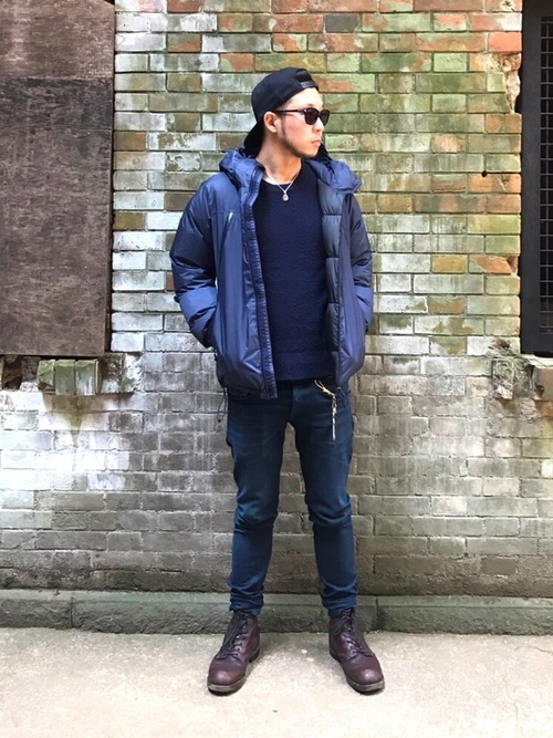 ブルー系のカラーでまとめたメンズコーデ。ジョガーパンツとダウンジャケット、スニーカーで、スポーティーな印象に仕上げています。ダウンジャケットはアーバンリサーチ別注コラボのオーロラダウンジャケット。