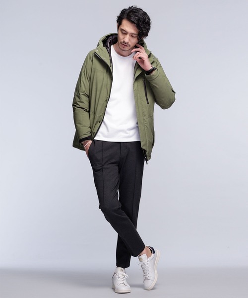 マウンテンパーカーをスタイリッシュにカスタマイズしたダウンジャケットです。内衿がついており、内側の裾には別素材で内スカートも付属しているので保温性と防寒性に優れています。動きやすさを考えた切り返しやステッチを最低限にすることで、ダウンでも野暮ったく見えずシャープなシルエットに仕上がっていることも特徴です。