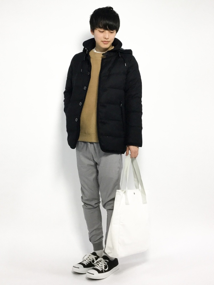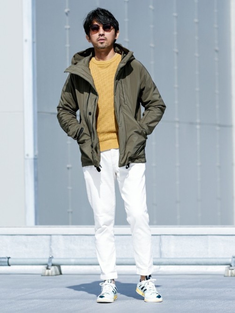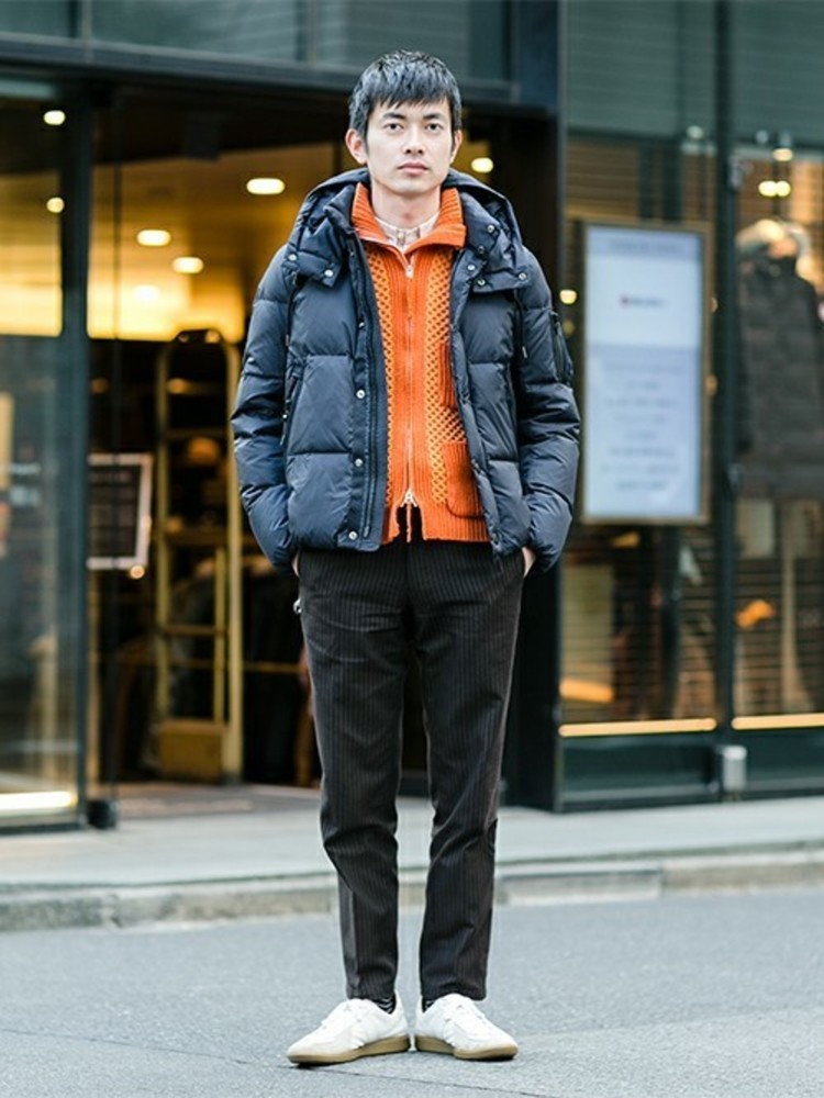 立体感のあるダウンジャケットに、細身のパンツを合わせバランスよく着こなしたカジュアルコーデです。中に合わせたオレンジのジップアップニットカーディガンと、白スニーカーで着こなしを暗く見せないよう工夫を加えています。