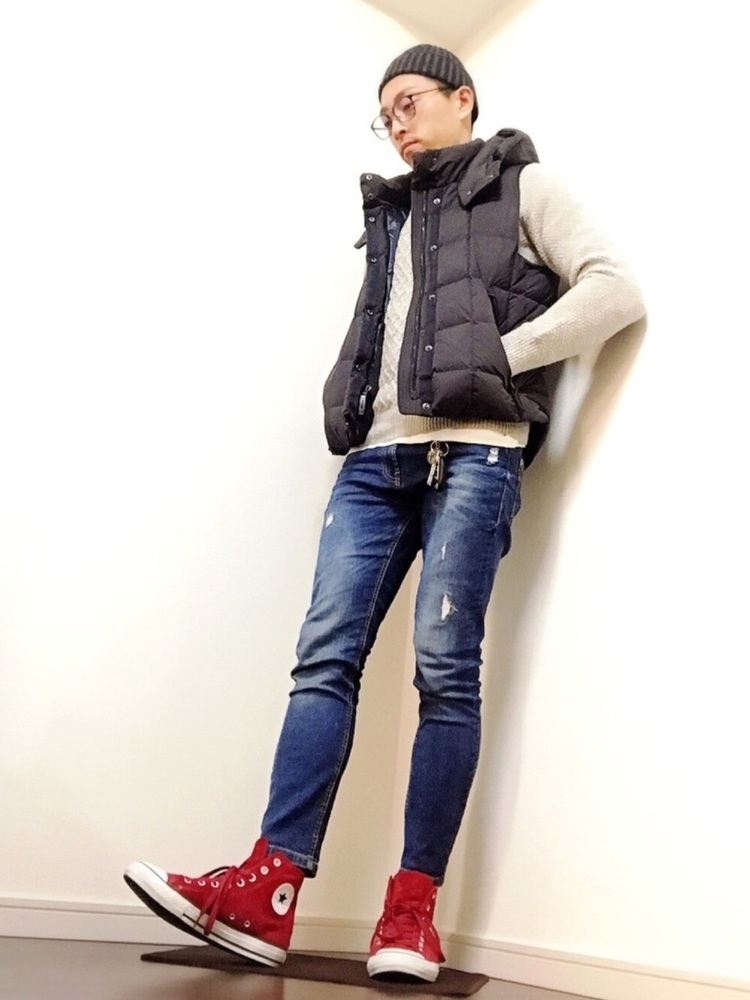 軽くダメージ加工が施されたデニムとハイカットスニーカーで、アメカジ風に整えたメンズコーデです。デニムはスキニータイプを合わせIラインを意識すると、アメカジスタイルでもスタイルアップ。黒のダウンベストでコーデを引き締めることで、大人っぽさを叶えています。