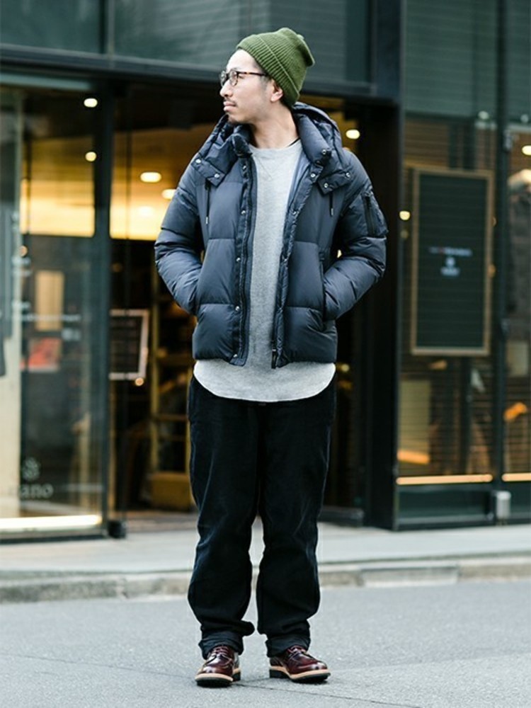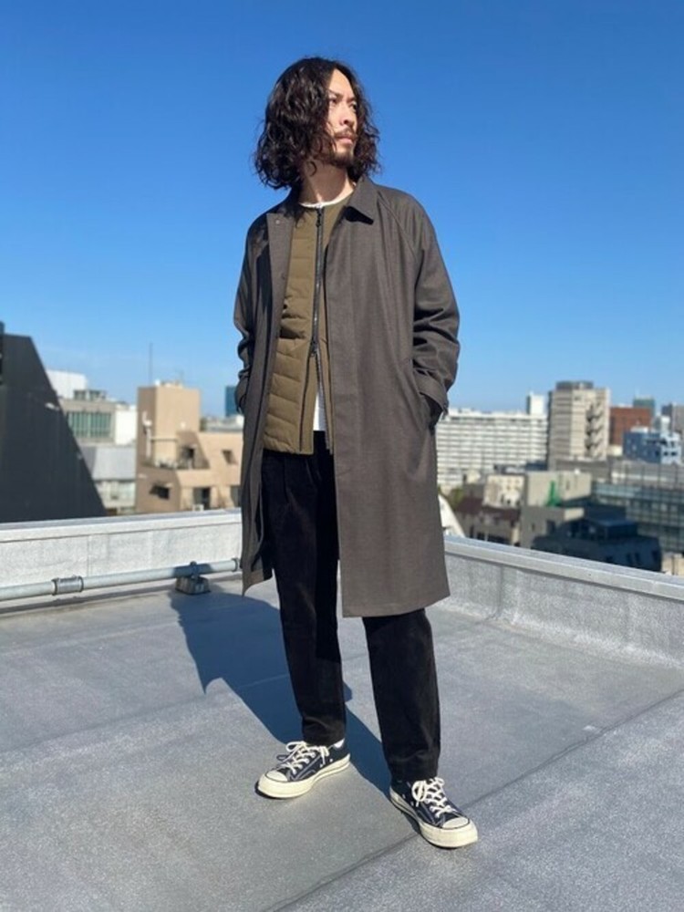 バルカラーコートの中にシェルダウンを重ね着して防寒した、リラックスコーデです。ブラウンとカーキのニュアンスカラーでまとめたバランス感も絶妙。ストレートシルエットの黒コーデュロイパンツで、しっかりメリハリも作っています。
