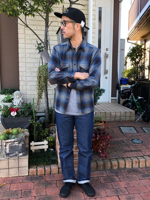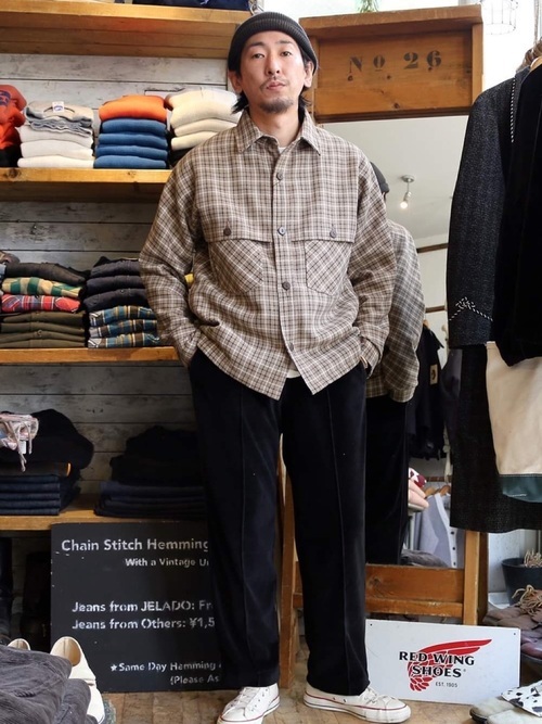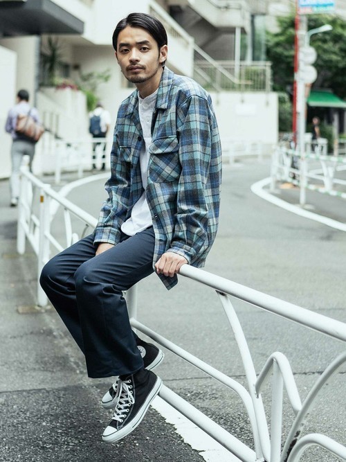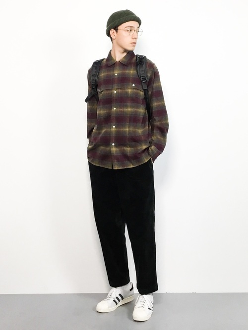 オーバーサイズ気味のペンドルトンのシャツと、ゆったりサイズのパンツとの組み合わせです。ラフな印象になりがちな組み合わせなのに、しっかりと決まっているのはブラックのスラックスパンツをチョイスしているか。キレイ目なアメカジスタイルのお手本です。