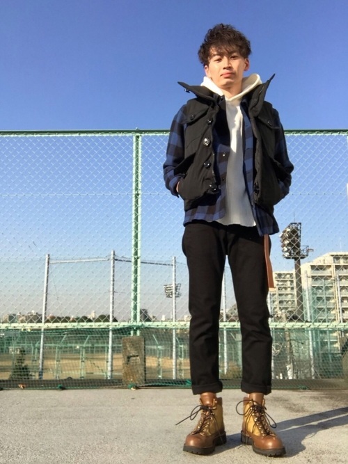 パーカー+ダウンベストは、似合う人を選ばない安定のメンズファッションコーデ。そこにペンドルトンのチェック柄ウールシャツをプラスすると、一気におしゃれ上級者のコーディネートに早変わりです。上半身にボリュームが出るので、体型に自信のないメンズにもおすすめしたい着こなし術です。
