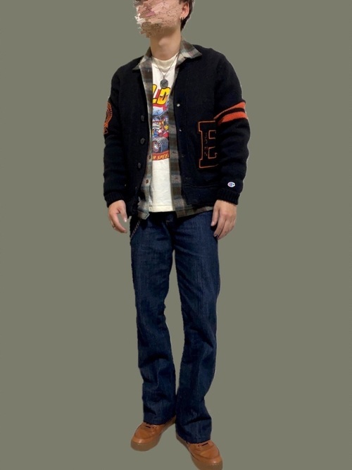 スタンダードなアメカジスタイルには、太すぎず細すぎないブルーのデニムパンツがぴったり。しかし、このコーデの難点は一歩間違うと、学生っぽくなってしまうところです。そこで、シューズはスニーカーではなくごつめのブーツを合わせると、子供っぽくなりすぎないのでおすすめです。