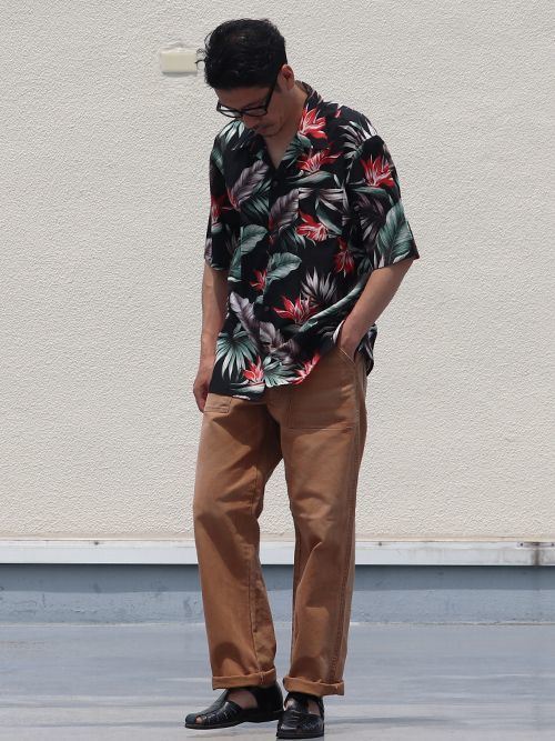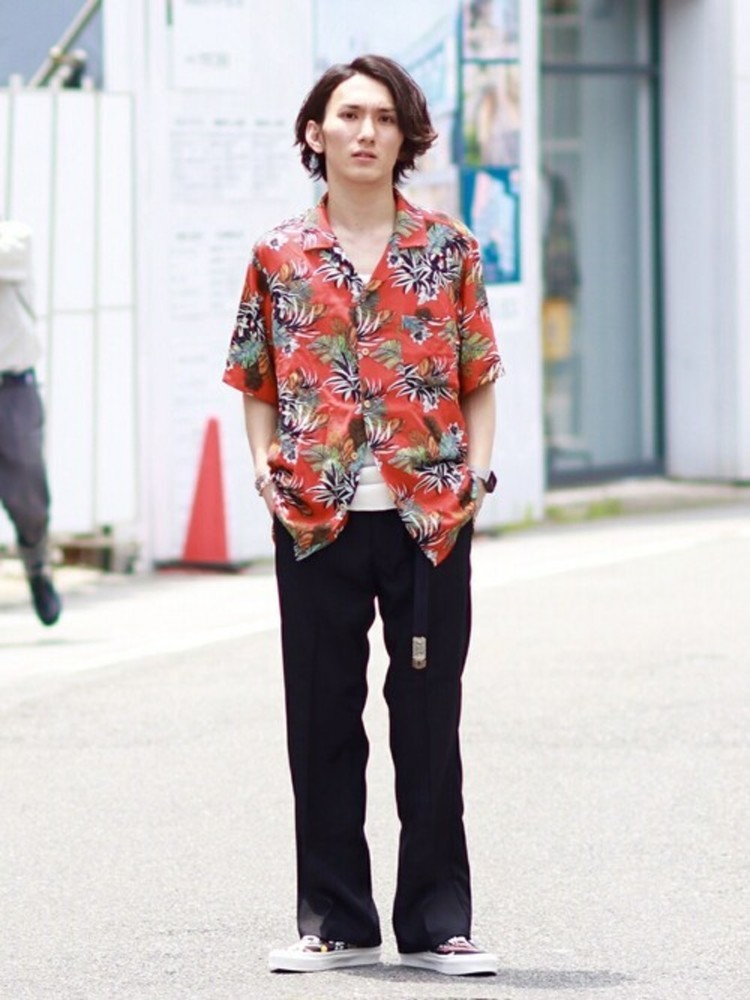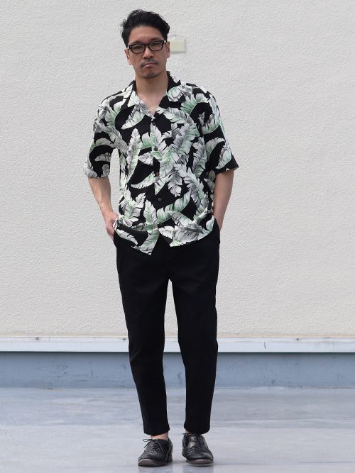カジュアルな印象の強い半袖アロハシャツは、ドレスライクなスラックスとの相性が抜群です。夏と言えどアロハ柄の主張は激しいので、パンツやスニーカーは黒でカラーダウンしてあげましょう。