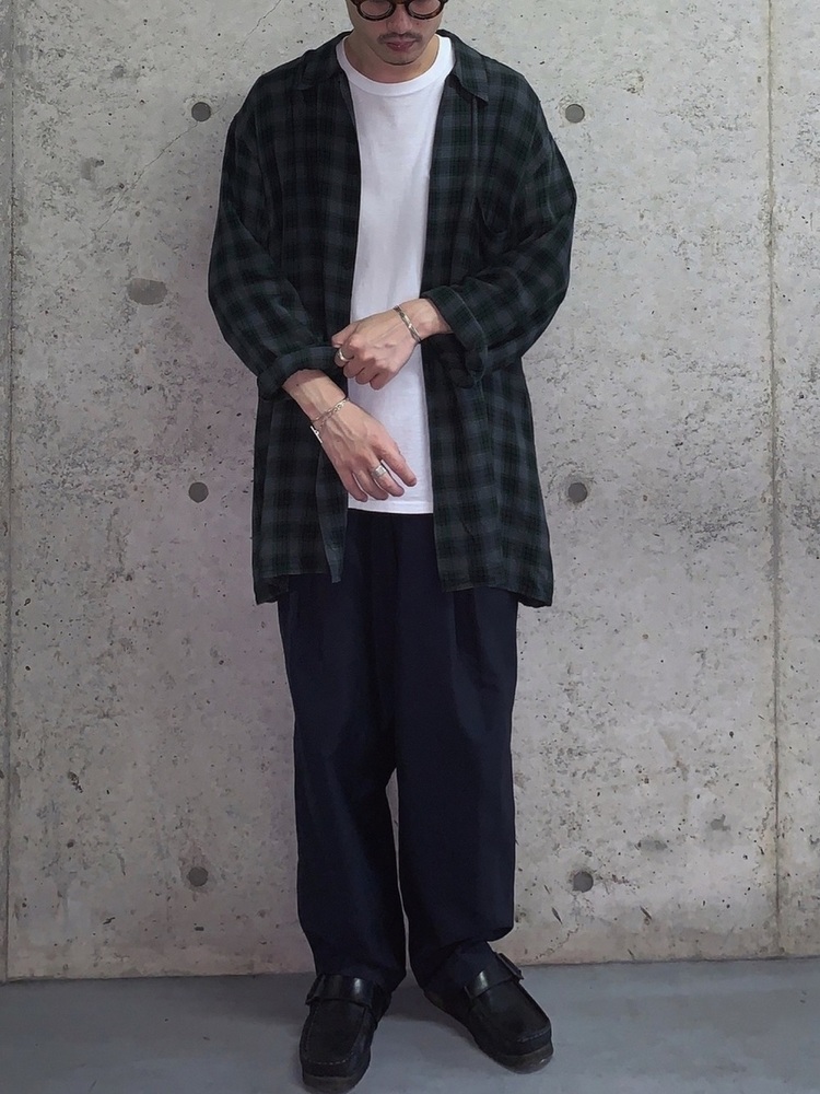 チェック柄のレーヨンシャツをゆったりめなボックスシルエットに仕上げ、単体でも着用できるように設計したアイテム。綿素材を混紡しやや起毛させることで、古着ライクな生地感も楽しむことができます。