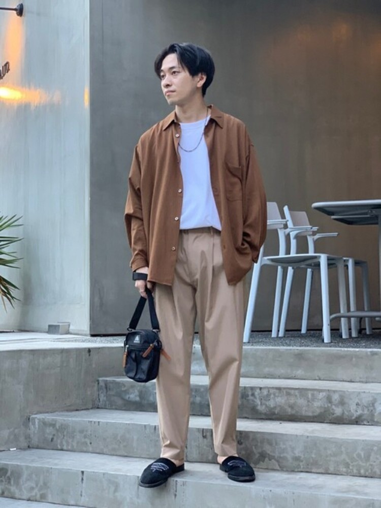 白Tシャツの上から長袖レーヨンシャツを羽織るスタイリングはメンズコーデの定番中の定番。無地の白Tシャツに柔らかな素材やベージュ、ブラウン等の色合いのアイテムを合わせることで、落ち着いたモダンカジュアルな着こなしに仕上がります。
