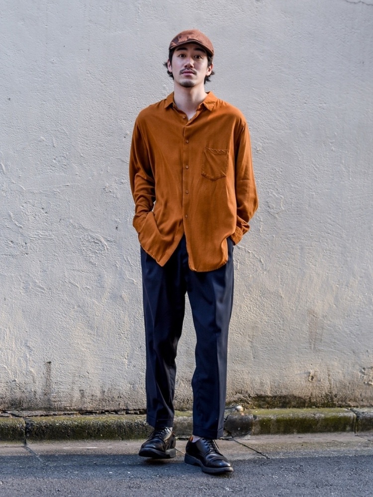 レーヨンシャツはゆったりとした大きめのサイズ感が旬。トレンドライクなシルエットを選ぶことで、ドレープのきれいさがより引き立ちます。また、単体で着用する場合には胸ポケットがあるとアクセントになっておすすめ。柄シャツの場合は、ダークトーンが着こなしやすくおすすめですよ。