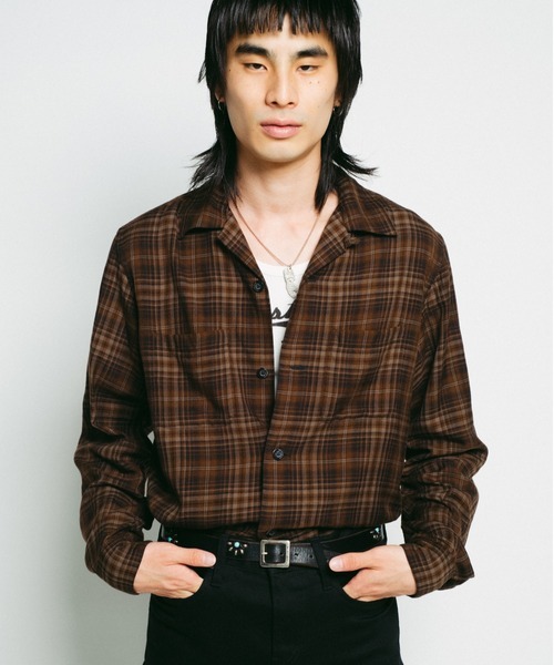 古着のディテールにインスピレーションを受け、裾にベルトを配したショート丈のレーヨンシャツ。チェック柄ですが、ダークトーンの深みのある色味なので着こなしの難易度は高くありません。