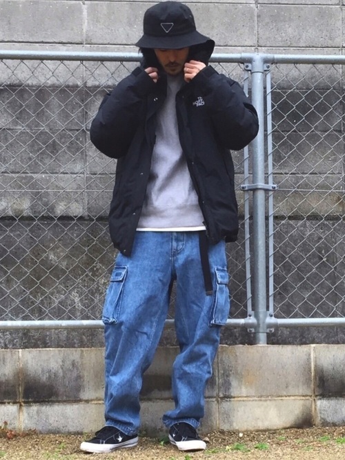 マウンテンダウンジャケットとデニム素材のワイドサイズパンツは相性抜群。インナーにスウェット素材を用いてラフさを出しています。メンズに人気なアメカジスタイルなのでスニーカーはもちろん、使いまわしができるブーツもおしゃれに相性がいいです。