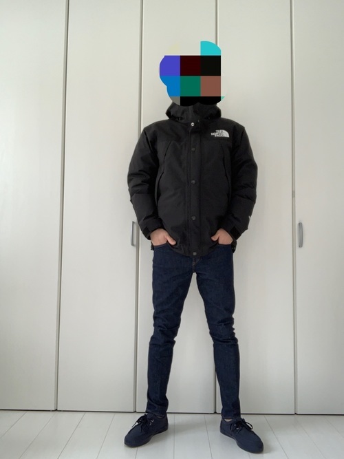 マウンテンダウンジャケットとジーンズのコーデ。細身のジーンズを合わせることでスタイリッシュなできる大人の男を演出。ボタンをすべて止めることで、メンズらしいセミフォーマルな印象を与えることができます。