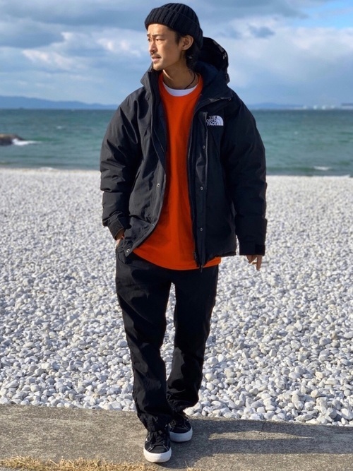 マウンテンダウンジャケットとオレンジのニットのコーデです。黒のマウンテンジャケットにオレンジ色のインナーを合わせることでおしゃれさを演出しています。シンプルなデザインを用いることでスマートなメンズの着こなしに。