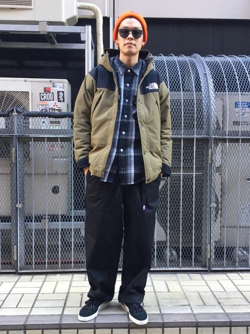 マウンテンダウンジャケットとネルシャツのアメカジコーデ。秋冬らしいチェック柄のデザインのインナーでメンズ感たっぷりの着こなしに仕上がっています。全体的に暗い色になりがちですが、オレンジ色のニットキャップが差し色がポイントです。