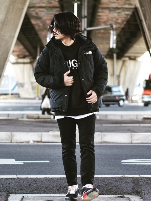 全身をブラック一色のアイテムで統一したコーデ。シューズやインナーの白色を少し垣間見せることでメンズに人気なシンプルかつ暗すぎない印象の着こなしにまとめ上げることができています。