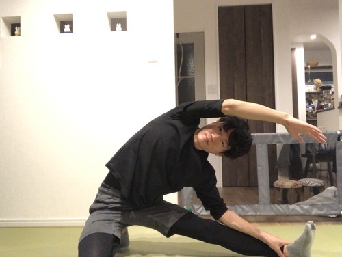 体を倒すときに、捻らずできるだけ真横に倒してみてください。そうすれば股関節に外旋の力が働くので、内転筋がよく伸びます。