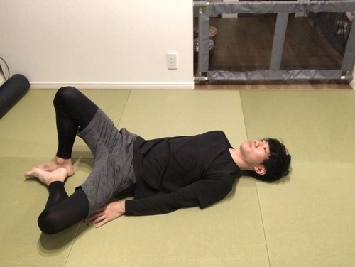 ① ストレッチを受ける側は仰向けに寝て、両膝を立て片方の股関節を開く