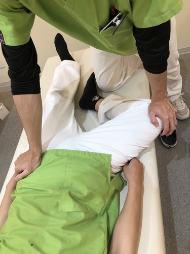伸ばす側の骨盤を抑えて、骨盤を固定しながら行うのがコツです。力としては骨盤を抑える側に重点を置き、膝の方はあまり力を入れず優しく押していきましょう。