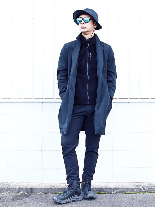 ジップインバーサミッドジャケットにコートを合わせたコーデです。全てのアイテムをダークカラーで統一することで、都会的な洗練された雰囲気の着こなしになっています。スタイリッシュにまとめ上げた中にノースフェイスのフリースを投入することで、程よくカジュアルダウンされたバランスの良いコーデです。
