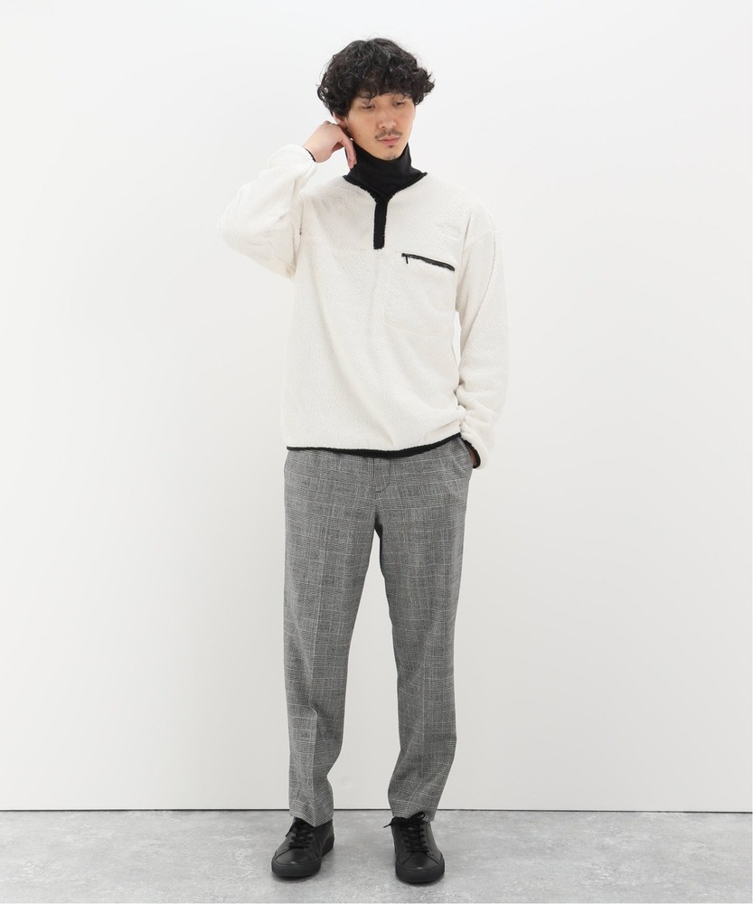 アンタークティカバーサロフトジャケットのインナーにタートルネックを合わせたコーデです。パンツにはグレーのスラックスを合わせることで、落ち着いた雰囲気のおしゃれな着こなしになっています。