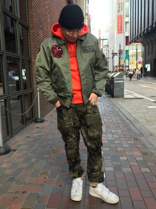カーキMA-1×オレンジパーカー×ミリタリー柄パンツ