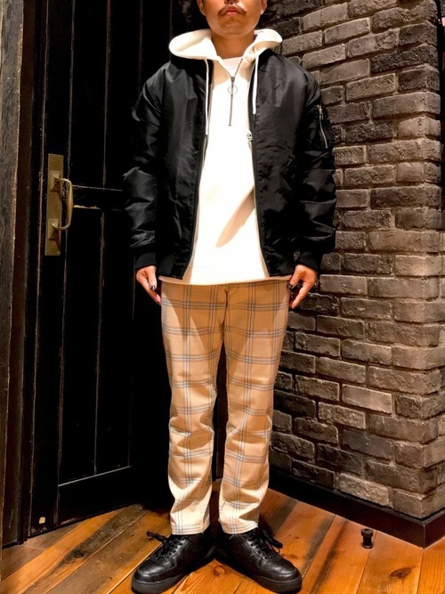 黒MA-1×白パーカー×チェックシェフパンツ×黒シューズ