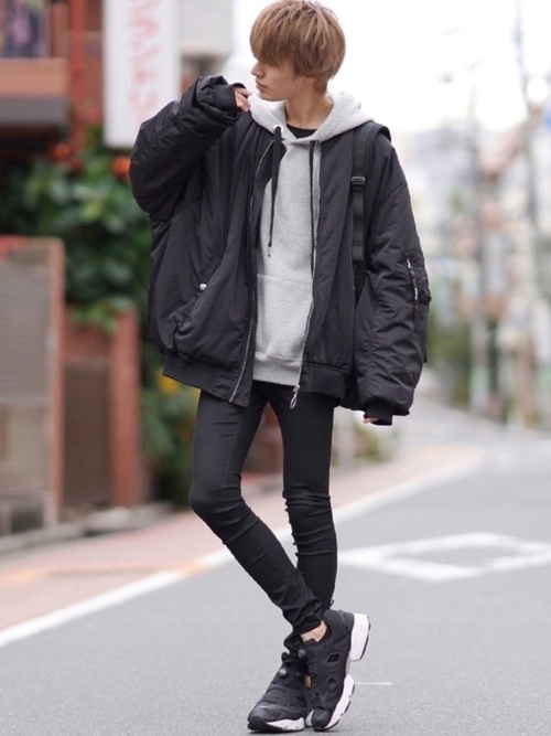 黒のMA-1とグレーのプルオーバーのパーカーという定番の組み合わせですが、ビッグサイズのMA-1をもってくることでボリュームたっぷりに仕上げています。インナーのパーカーと黒パンツをタイトめにすることで、バランスの良いスタイルに。スポーツデザインのスニーカーと合わせて今のトレンドを押さえたメンズコーデです。