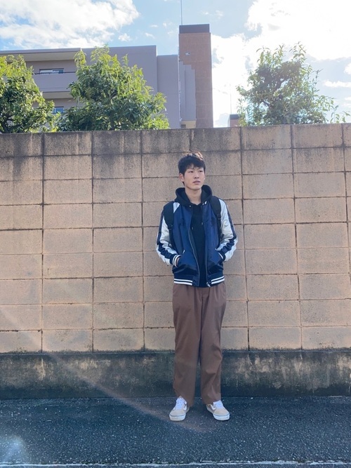 ネイビーMA-1×黒パーカー×茶パンツ×ベージュスニーカー