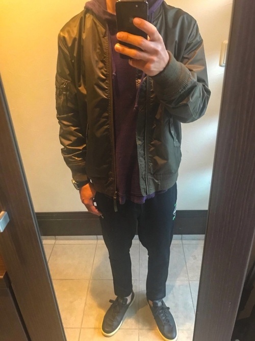 カーキMA-1×紫パーカー×黒パンツ×黒シューズ