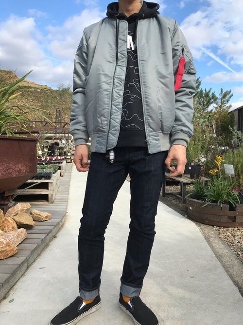 インナーやボトムスにネイビーや黒をもってきても、グレーのMA-1ジャケットなら柔らかい雰囲気に演出してくれます。インナーのロゴがコーデのアクセントになって、軽快さもプラス。