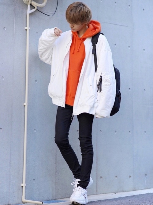 白MA-1×オレンジパーカー×黒デニム×白スニーカー
