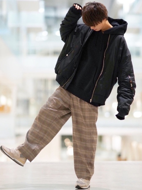 オーバーサイズのMA-1に、ゆったりしたベージュパーカーとベージュのパンツというトレンドのゆるコーデスタイル。ストレートシルエットで薄くチェックが入ったパンツがカジュアル感を抑えており、おしゃれ度の高い着こなしになっています。パーカーの裾から見えるレイヤードの白も良いアクセントになっています。
