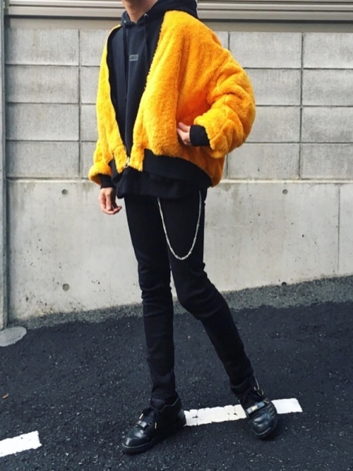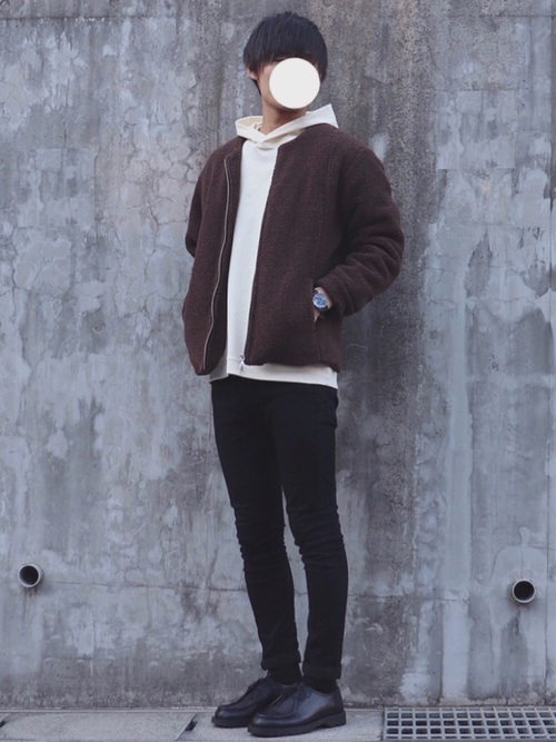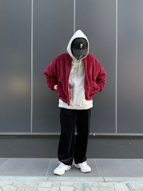 流行りのボア素材のMA-1はタイトめを選ぶとちょうどよいボリューム感になります。オーバーサイズのパーカーにコーデュロイのワイドパンツというゆるいストリートファッション。秋冬にぴったりのメンズコーデです。