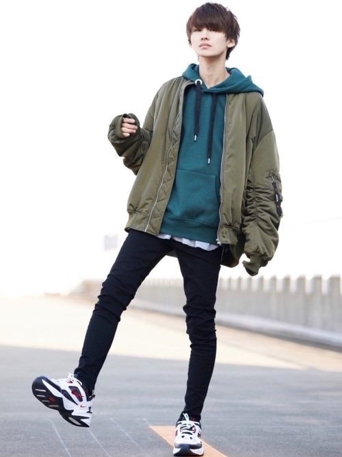 インナーのパーカーにオーバーサイズの服を選ぶと、ルーズな着こなしが今風のおしゃれコーデになります。オーバー過ぎないサイズ感のMA-1を選ぶのがコツです。パンツをタイトなものにして、靴にボリュームを持たせてバランスをとるのもポイント。