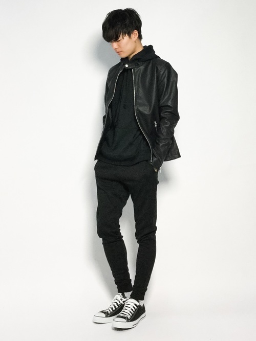 全体を黒で統一したワントーンのメンズコーデ。インナーのワンポイントの薔薇に目が惹きつけられます。白カットソーのレイヤードは、コーデにメリハリができるおしゃれなテクニックなので、ぜひ参考にしてください。足元にボリュームをもってくることで、全体のバランスもとれています。