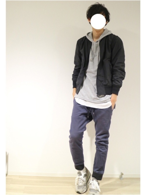 黒のMA-1とグレーのプルオーバーパーカーという定番中の定番といった組み合わせ。誰でも真似しやすく、初心者でも失敗しにくいおすすめのメンズコーデです。アイテムをすべてタイトめで揃えているので全体がすっきりとしたおしゃれな印象に。9分丈のジョガーパンツもMA-1とのバランスがとれています。