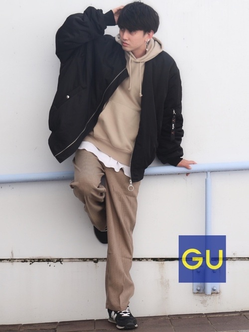 黒MA-1×ベージュパーカー×ベージュパンツ×黒スニーカー