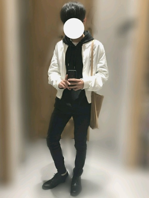 黒MA-1×黒パーカー×白カットソー×黒デニム×黒シューズ