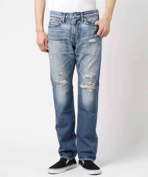 ナチュラルな色落ちとフェード感を加え、長年履き続けたような風合いを特殊なエイジング加工で表現したデニムです。軽く入った破れ加工もアクセントとなっています。太腿から裾にかけて、若干スリムなシルエットになっているためゆるカジスタイルでまとめても、野暮ったく見えません。