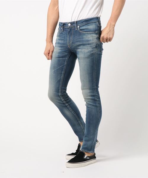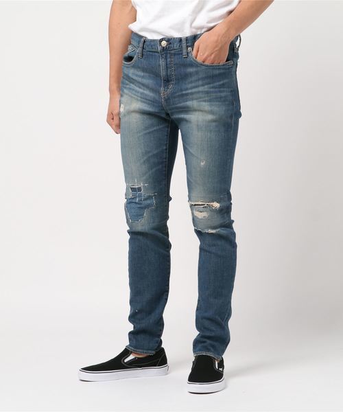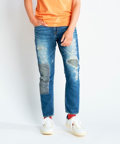 太腿と膝を中心にクラッシュを与え、色味や表情の異なる別の生地で当て布をし適度なダメージ加工に抑えたデニムです。ダメージがハードではないため、幅広いコーデに合わせたい人やダメージデニム初心者の人におすすめ。また、コシと伸縮性の高いデニム生地を使用しているので、しっかりフィットしストレスのない履き心地を実感できる1本となっています。