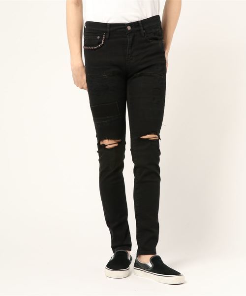 長年履き込んだようなダメージを再現し、ダメージ箇所にはデニム、スレキを使用しリメイクしたスキニータイプのデニムです。両膝の上部分に大きめに開けた穴がデザインのポイント。世界トップクラスのシェア率を誇るイスタンブールのデニム素材メーカーISKO社の素材を使用し、ストレッチが効いたデニムに仕上げていることも特徴です。