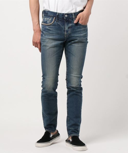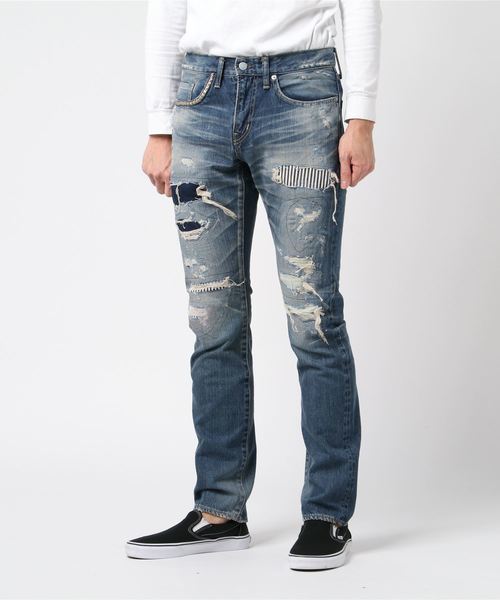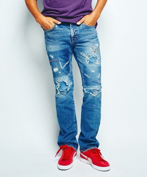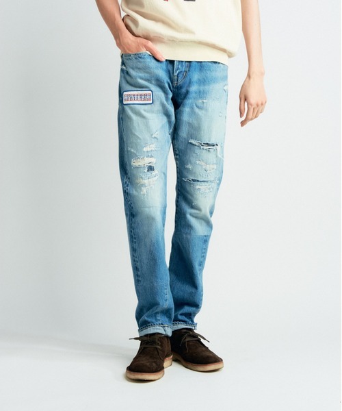 セルビッチデニムに、リアリティを追求したユーズド加工や大胆なクラッシュやリペア加工を施したストレートデニムです。スネから裾へ切り替えを入れ、膝下のシルエットを細くリメイクしたような雰囲気に仕上げていることもポイント。右腿につけたパッチカスタムも、こなれ感を高めてくれます。